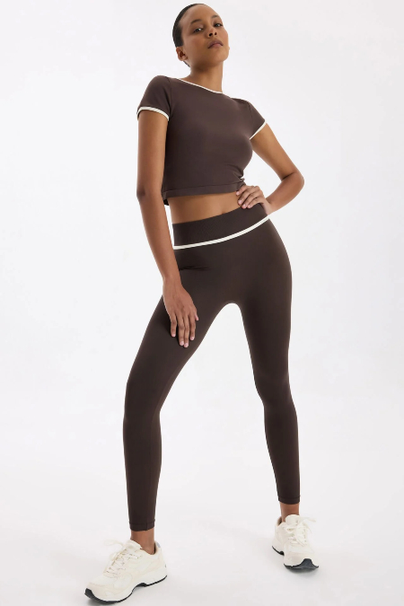 Kontrast Biyeli Spor Tayt ise kahve renginintonlu kontrasttaki zarafetini sportif bir çizgide yeniden yorumluyor. Yumuşak dokulu teknik kumaşı, vücudu dengeli biçimde sararken dikişsiz formu sayesinde pürüzsüz bir görünüm ve maksimum konfor sağlıyor. Yüksek bel tasarımı karın ve bel bölgesini toparlayarak sıkı ama rahat bir oturuş sunuyor. Kırık beyaz kontrast biyeler sıcak kahve tonuna zarif bir ışıltı katarken, tasarımı dinamikleştiriyor. Reflektif logo, düşük ışıkta görünürlük sağlarken modern bir vurgu yaratıyor. Aktif yaşam temposuna uygun bu tayt, ister antrenmanda ister şehirde güçlü ve sade bir stil yaratıyor.