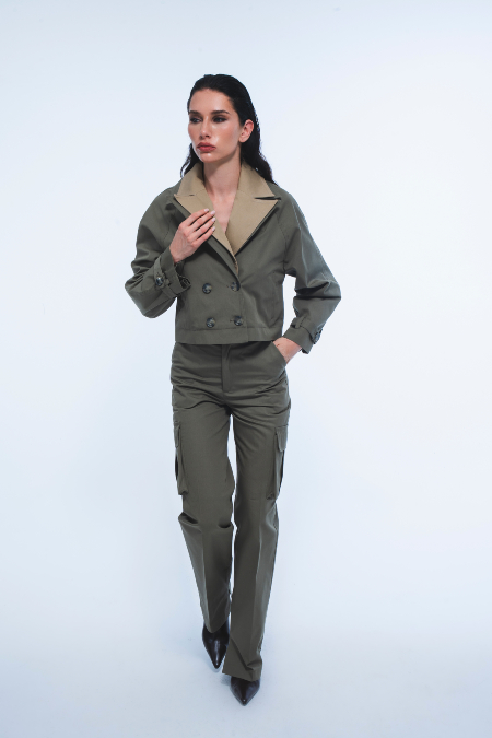 Krep ve viskon karışımlardan denim yüzeylere, kaşe ve pamuk dokumalardan hafif parlak saten dokulara uzanan kumaş seçkisi; tasarımlara net çizgilerle birlikte yumuşak bir geçiş etkisi kazandırıyor. Pantolon-ceket takımlar, yelekler, şortlar, gömlekler ve elbiseler; tek başına güçlü, birlikte ise bütünsel bir görünüm oluşturacak şekilde kurgulanıyor.
