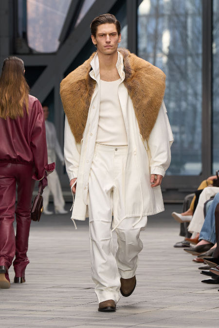 Tüm stillerde siluet uzun ve düz bir görünüm sergiliyor. Kusursuz ve dar terzilik detayları, beklenmedik sırt dekolteleri ve kolsuz dokunuşlarla tasarımlarda bir araya geliyor. Yoğun işçilikle hazırlanan elbiseler, sade arka yüzeylerle kontrast oluşturuyor. Beyaz yakalar görünümleri öne çıkarırken, biker yakalar tasarımlara daha sert bir hava katıyor. Shearling yakalar ihtişam duygusu yaratıyor ve bu detay zamanla tam bir shearling paltoya dönüşüyor. Doku ve renkler, koleksiyonda kentsel bir atmosfer oluşturuyor. Nötr tonlar koleksiyonda hakimiyet kurarken, turuncu ve bordo tonları görünümü canlandırıyor. Koleksiyon, yün, jarse, kadife, lamine saten, pamuk, grogren ve spazzolato ile opak ve transparan derilerle geniş bir kumaş seçkisi sunuyor.